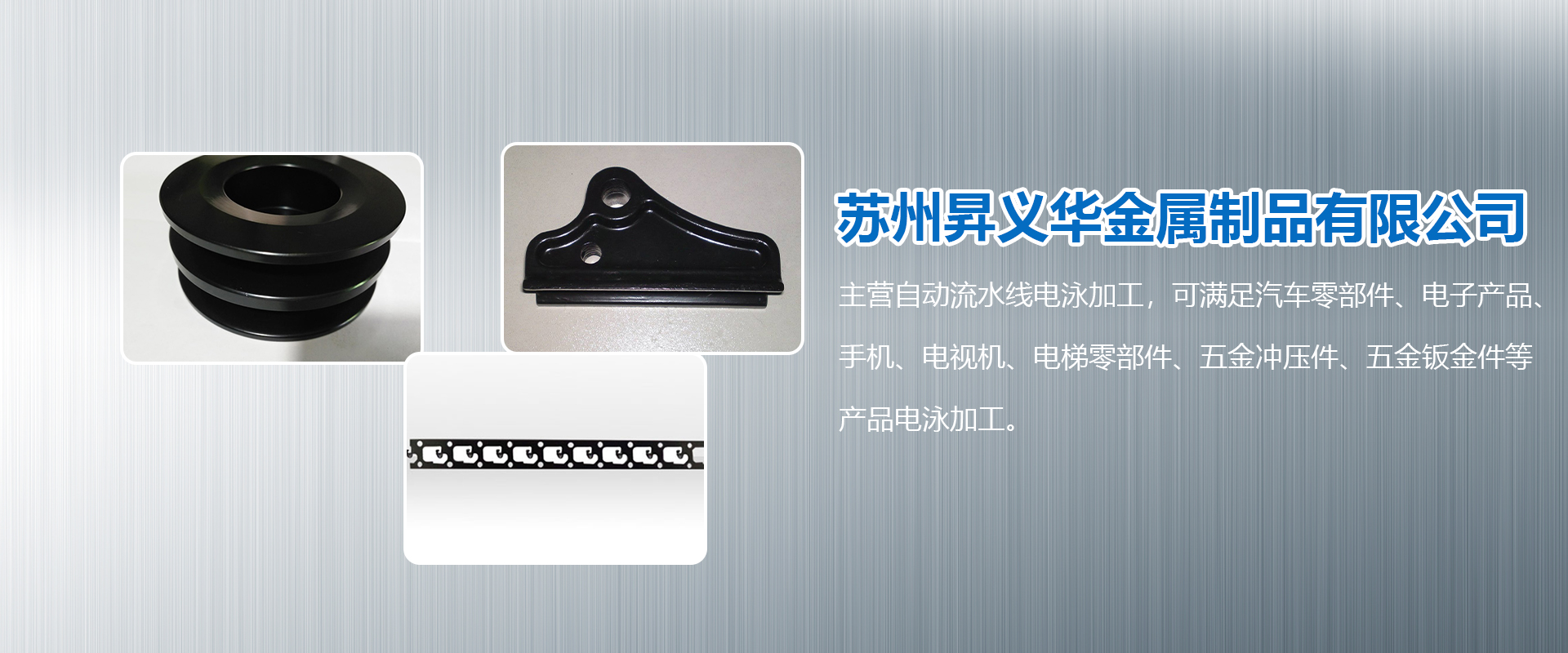蘇州昇義華金屬制品有限公司是一家進(jìn)行各類金屬表面處理專業(yè)公司。主營自動流水線電泳加工,可滿足汽車零部件、電子產(chǎn)品、手機(jī)、電視機(jī)、電梯零部件、五金沖壓件、五金鈑金件等產(chǎn)品電泳加工。